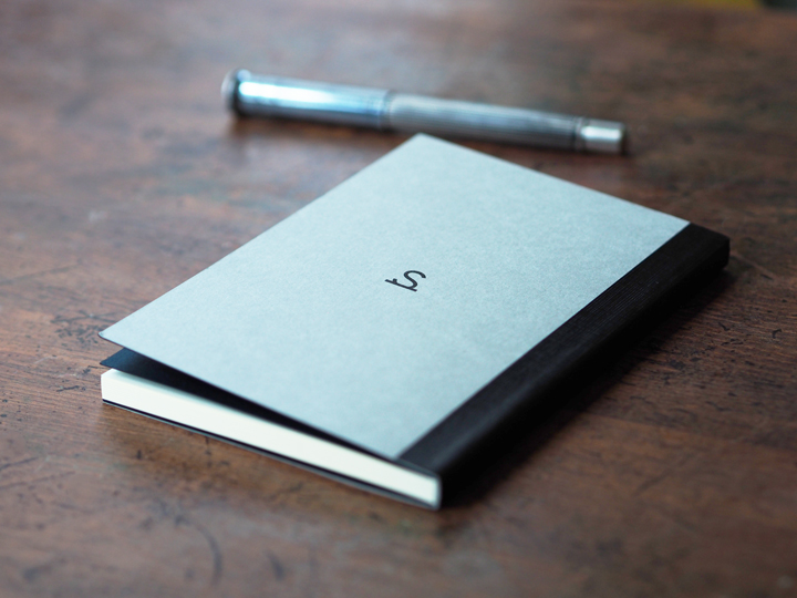A6判サイズの極力シンプルなレイアウトの表紙で、WILDSWANSの革小物用の箱と同じようにグレーの紙を用いています。中身は従来のMONOKAKIノートと全く同じ仕様の内容で、本文は満寿屋さんオリジナルのクリーム紙を用いた罫線有りの160ページ、見返しの厚紙は濃紺です。