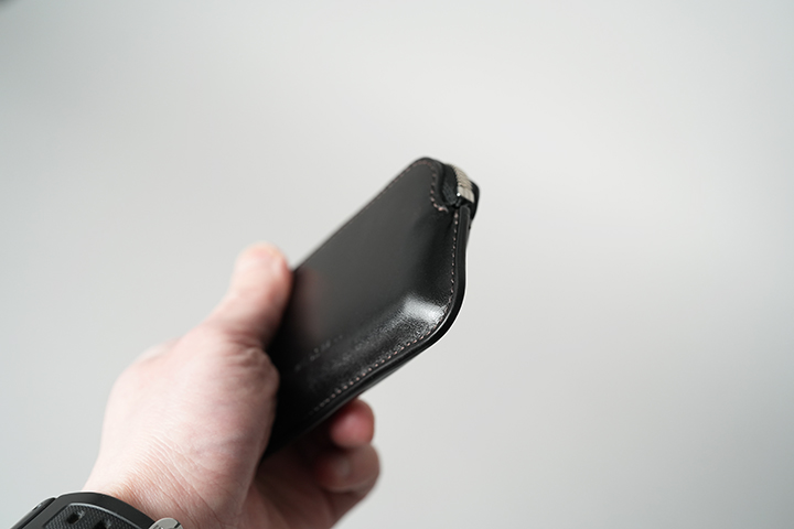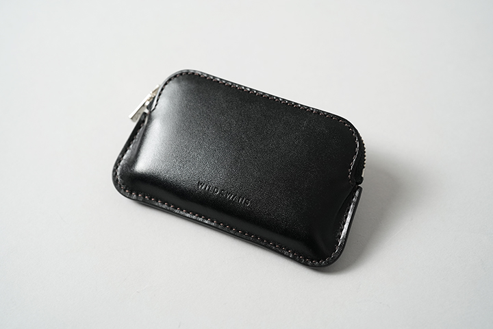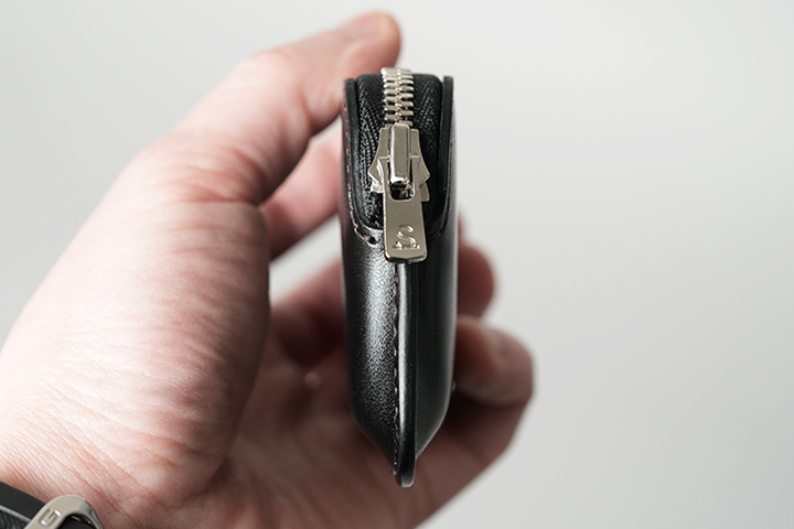 MINASの外観は非常にミニマルなディテールです。本体の底にかけて両サイドにやや広がる形状です。外装の2枚のパーツを合せたコバ部分は他のWILDSWANS製品と同じように、熟練の職人たちの技が光る仕上がりです。WILDSWANS製品の中でも最小の部類に入るMINASですが、こちらのコバによりWILDSWANSらしい力強さが備わります。MINAS唯一の収納部は底から膨らみを持たせた形状により見た目以上の収納量があります。また、本体上部から左右両サイドまで伸ばしたファスナーにより、中身の視認性や取り出しやすさも意識して設計されています。こちらのファスナーは、こちらもWILDSWANSではお馴染みのYKK社のエクセラファスナーです。内部にはプラスチック製のカードが6~15枚収納可能です。(カードの種類や革の馴染み具合により、収納枚数が変動します。)