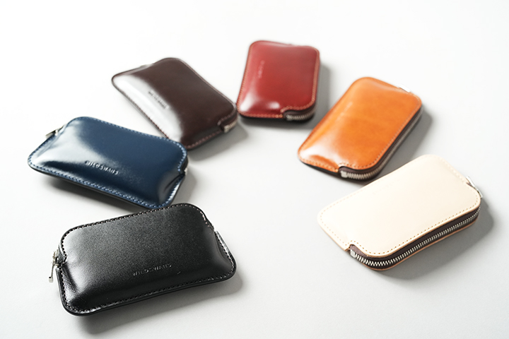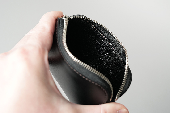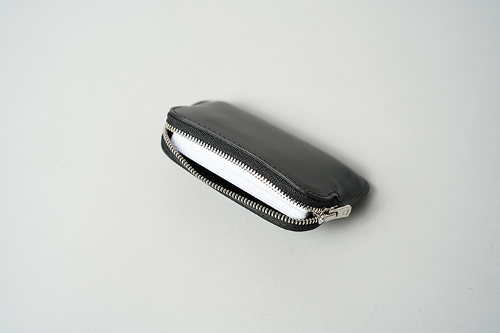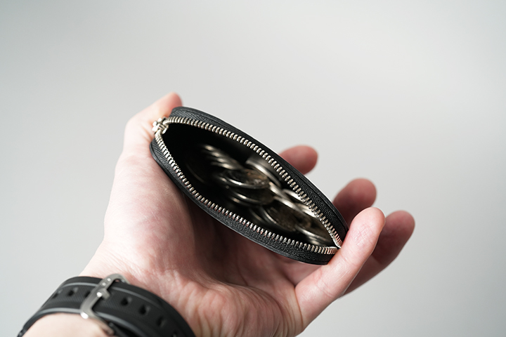 また、上の画像では100円硬貨では21枚収納していますが、容量としてはあと10枚ほど収納できそうです。ちなみにMINASの内装に使用されている皮革は、外装と同じカラーの型押しのサドルプルアップです。ファスナー付きで持ち運びも安心なことから、カードキーなどの収納にも適したMINASは使用用途が幅広いことも特徴です。また、どなたにも手軽にご使用頂けることから、プレゼントにもおすすめなアイテムです。