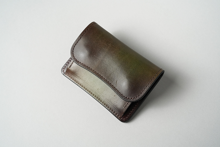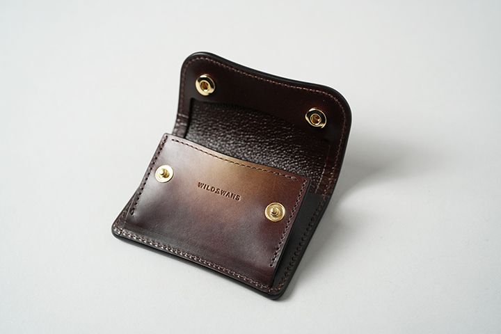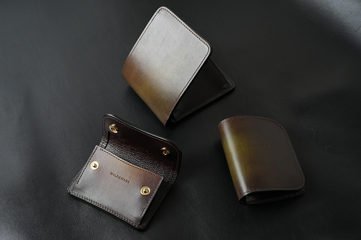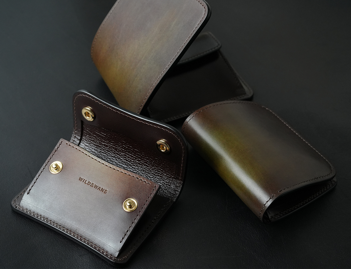 コインケースのTONGUEはWILDSWANSでもお馴染みのアイテムで、コインのみならず、カードや折りたたんだ紙幣まで収納可能です。以前から展開するスフマートでもほぼ必ずと言って製作されていますが、グリーンとブラウンをベースにした色彩は、往時の雰囲気をしっかりと残しています。スフマートの使用パーツは背面ポケットを含めた外装全面とコインケースの前身表側です。その他の部分は、サドルプルアップのチョコのスムースまたは型押し革を組み合わせています(コインケース内の両マチ裏とベロパーツ裏はサドルプルアップのトコ面仕様です。)。