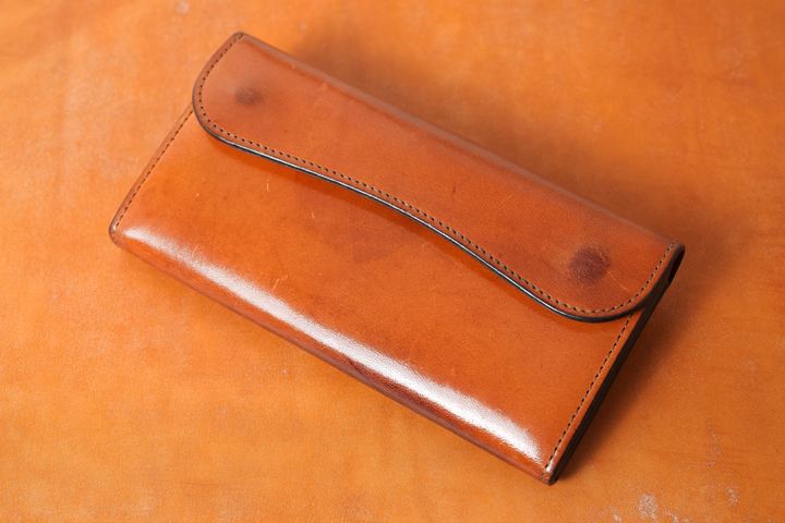 ・弊社製品は縫製の始点と終点の糸が抜けないように熱処理を行いますが、ブライドルレザーなどのワックス成分を含む皮革の場合には、周囲の粉状のワックス(ブルーム)が溶けることで粉状ではなくなり、その部分だけ革本来の色味が見える状態になることがあります。革自体に影響がある程の熱ではございませんが、ワックスは融点が低いためにこのような跡になり、またブルームの量が多い個体ほどより顕著に現れます。