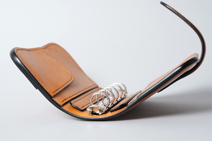 フルグレインブライドルはイギリスのベイカー社が製造するタンニン鞣しの牛革です。オークバーク(オークの樹皮)から抽出したタンニンを使用し、約1年という長い時間をかけて伝統的な技法で鞣されています。ギン面(革の表面)を残しつつも手作業で丹念に加脂を行うことで、内部の繊維に脂分がしっかりと浸透した耐久性の高い革に仕上がっています。革表面に浮き出たロウのムラ感や表面にそのまま残る傷跡等は製品に力強い印象をもたらし、さらに使い込むことで唯一無二の愛用品へと変化をしていきます。