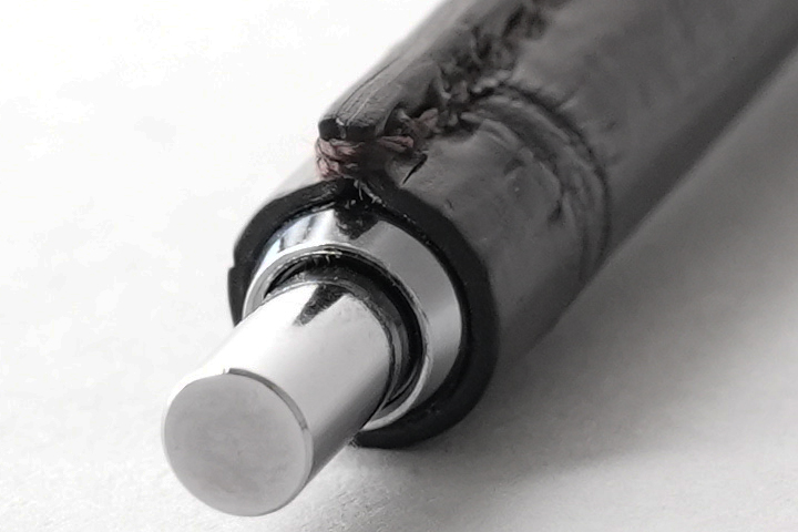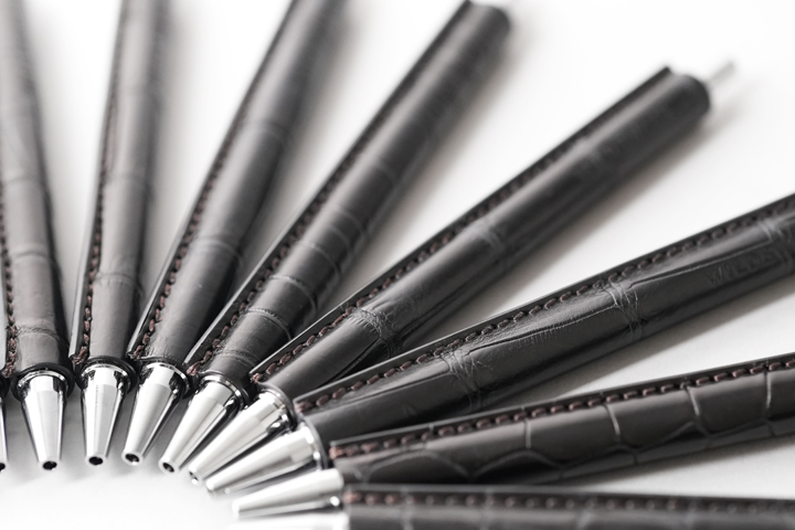 金属の軸にクロコダイル皮革(ブラック)を巻き付け、継ぎ目を縫製して仕上げた贅沢なボールペンです。