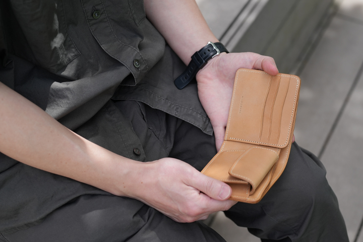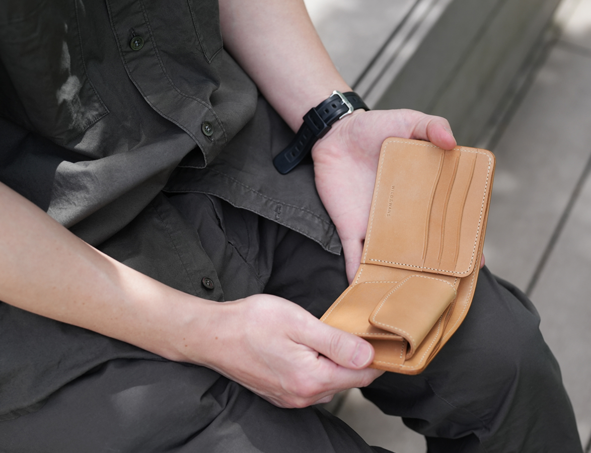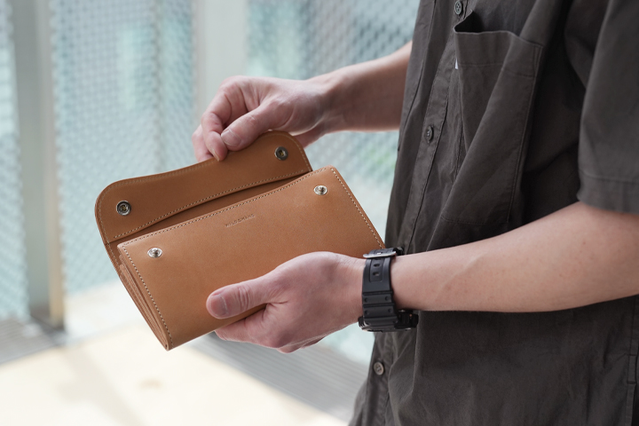 オーソドックスな二つ折り財布。頑丈で存在感のあるアイテムは、革を育てる楽しみもひとしおです。
