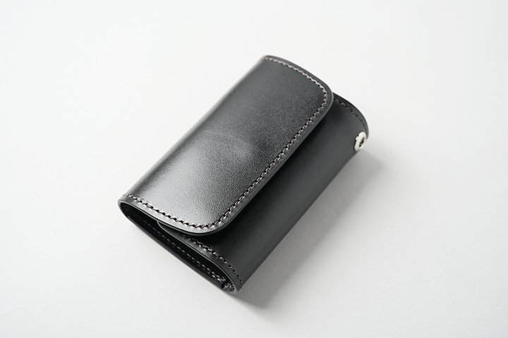 外装は一枚革をぐるりと巻くように形成されており、本体側面にはハトメが取り付けられています。フラップは1点のホックで開閉します。