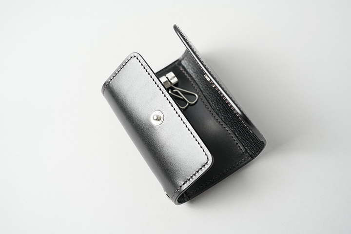 内装の4連キーフックはamiet社製のもので、向かって左側の大振りなキーフックは厚みのある鍵の収納を想定しています。キーフックの背面にはカードポケットを設けており、左右どちらからでも収納できる仕様です。フラップが開口部を覆うため、抜け落ちる心配もありません。プラスチック製のカードでしたら2枚ほど収納できますが、同時に収納する鍵の厚みによって枚数を調節してお使いください。