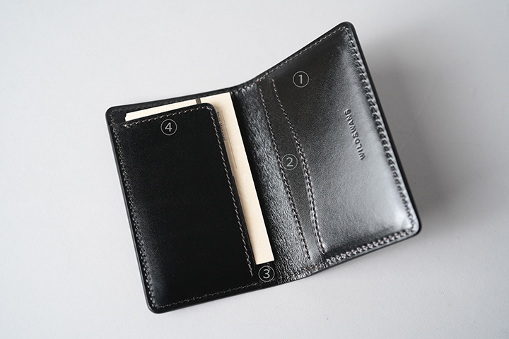 内装は4つのスペースから構成されています。各ポケットの名刺収納枚数と併せてご覧ください。