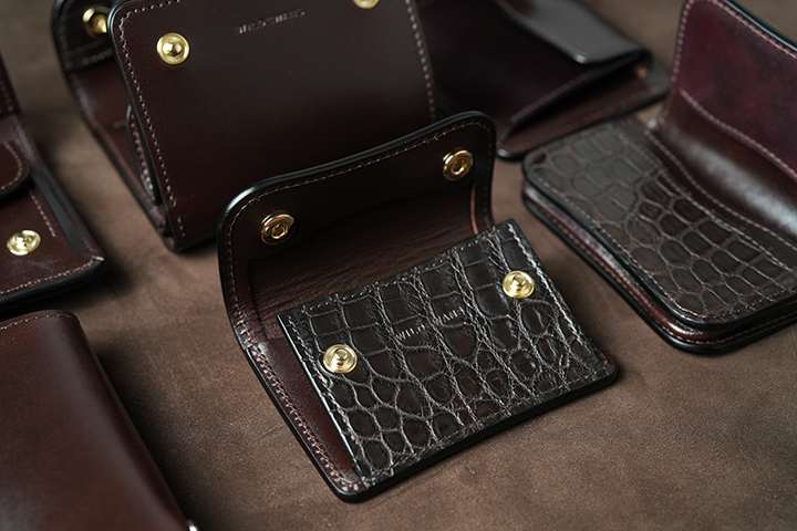 ブランドのアイコンとも言えるTONGUEは、コインケースの前身部分にクロコダイル、外装の背面にシェルコードバンがあしらわれています。GENERALと同様にとてもコンパクトなアイテムですが、1つのアイテムで3つの皮革を同時にお楽しみ頂けます。