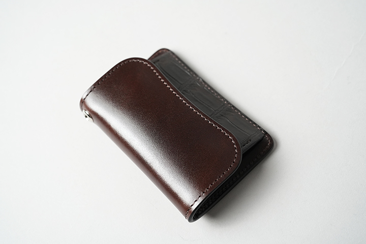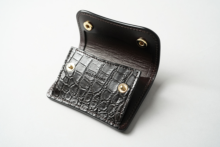 WILDSWANSのミニ財布では一番容量が多いCASA。優れたカード収納を備え、内装のフラップ背面には7~8枚のカードの収納が可能です。この他に札室やコインケースも装備しています。シェルコードバンはTONGUEと同様に外装背面のポケット、クロコダイルはフラップ裏の先端部分にあしらわれています。