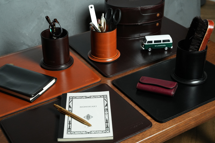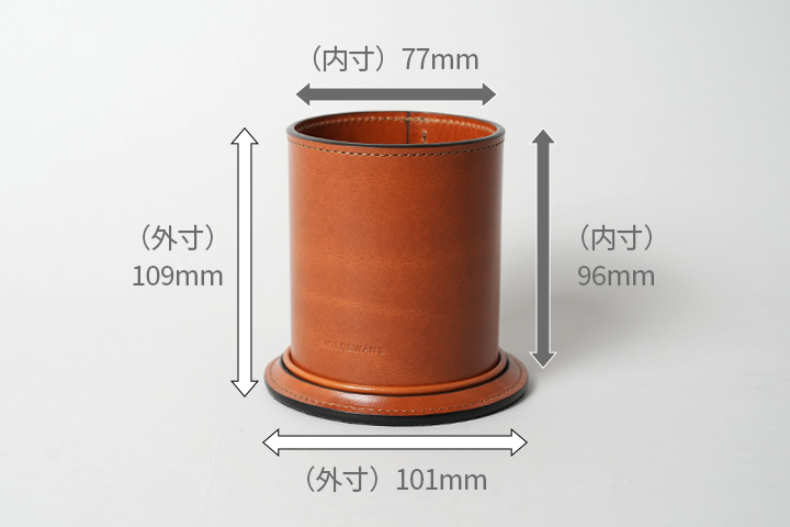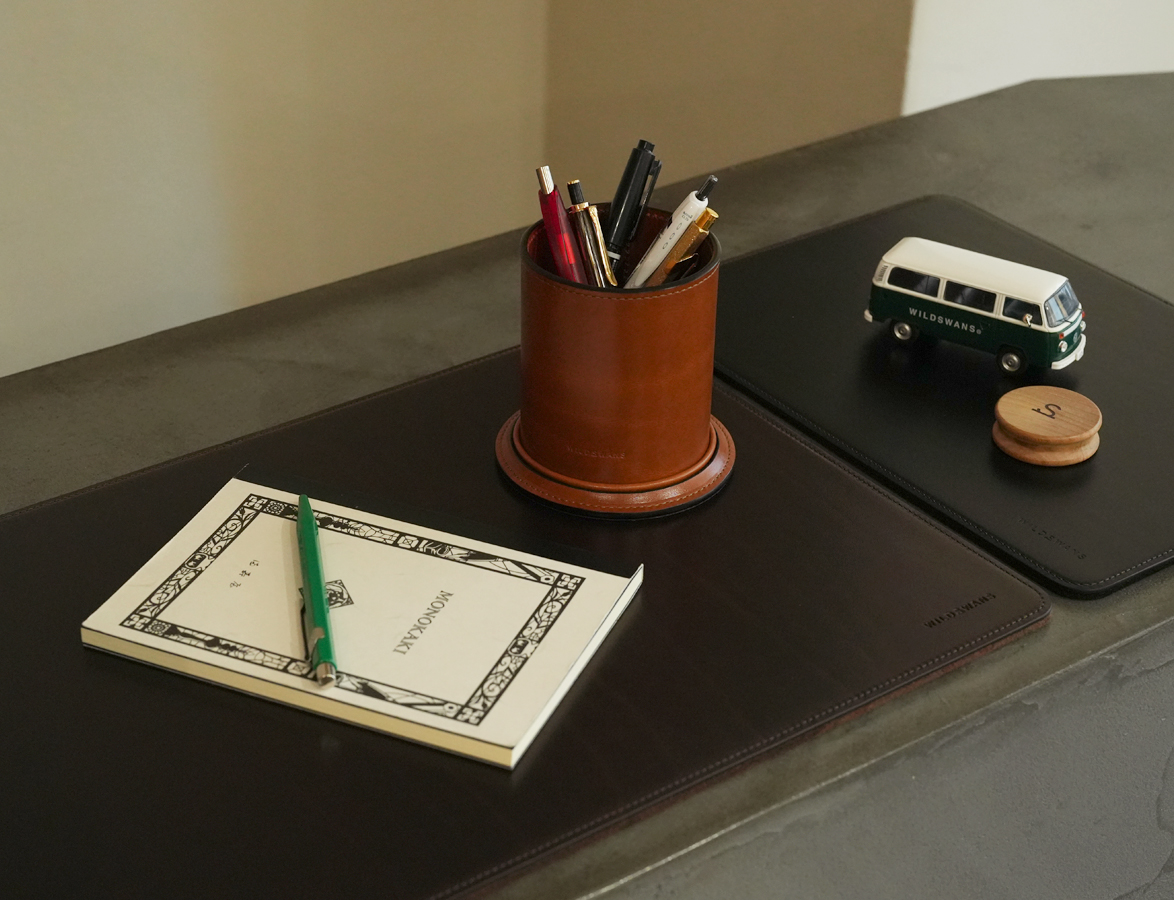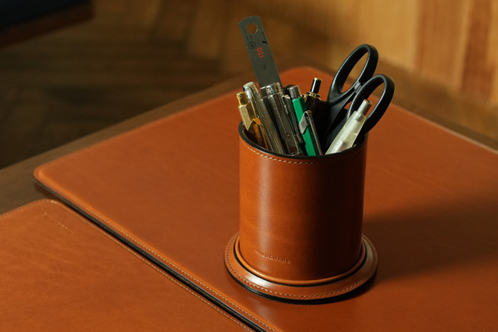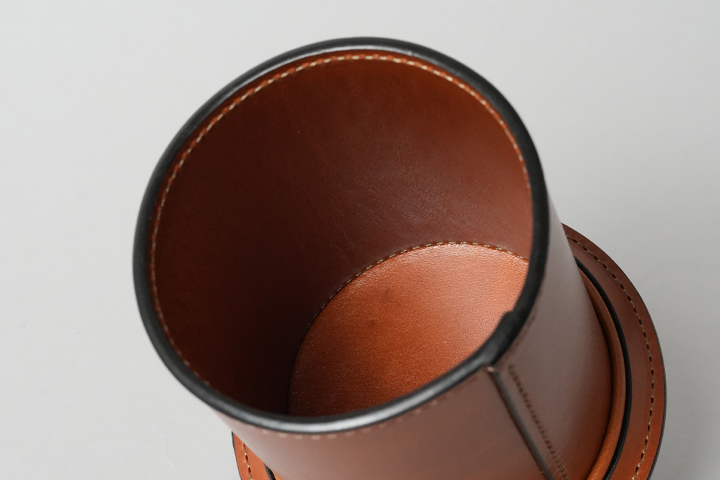革を筒状に丸めた重厚感のあるペン立て。