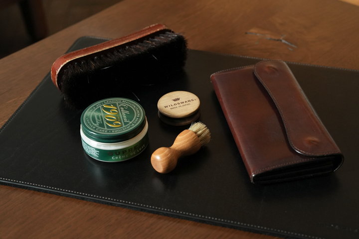 底部分には革が数枚貼り合わされ、末広がりになっていることで安定感があります。この末広がりになっている様子がモデル名CHAPEAU(仏語:帽子)の由来にもなっています。