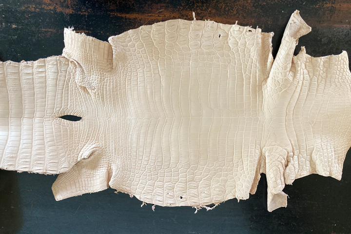 WILDSWANSでごく稀に登場するヌメクロコ。ヌメの定義は様々ですが、WILDSWANSでは、「植物由来のタンニン鞣し」と「無染色」で仕上げた皮革がこちらに該当します。このようなプレーンな見た目のヌメクロコは、無染色の鱗が神々しく縁起の良さを感じさせる皮革です。この特別な皮革に組み合わせるのは、知る人ぞ知るフランスの敏腕タンナーであるバスタン&フィスが生産するヌメ革です。サドルプルアップにも劣らない強いハリ感は、製作するアイテムの体幹を揺るぎないものにします。また、どちらの皮革もヌメ革であることから、変化の幅が大きなエイジングを遂げます。ただし、素材ごとにその変化は微妙に異なり、それ故にコントラストの効いた見応えのあるエイジングが期待できます。上の画像2枚目は1年使用したヌメクロコのエイジングサンプル、4枚目は数ヶ月使用したバスタン&フィスのヌメ革のエイジングサンプルです。