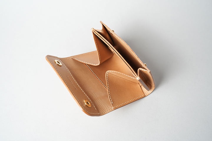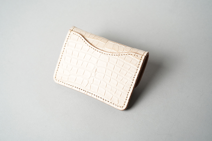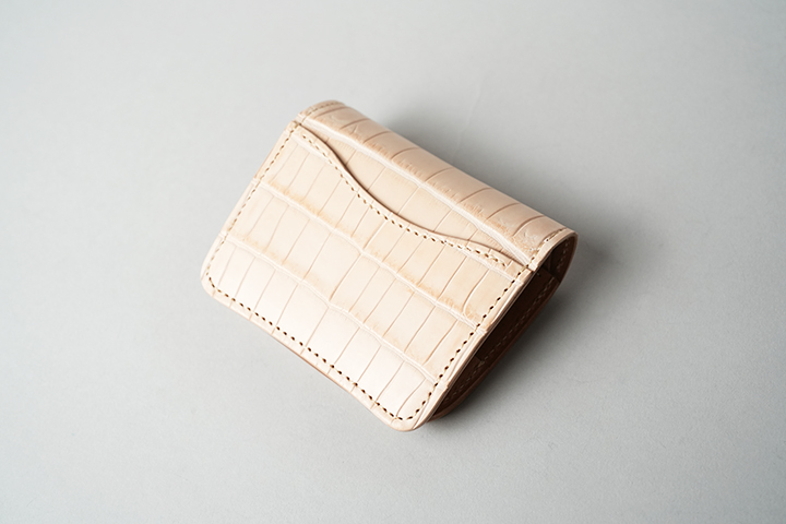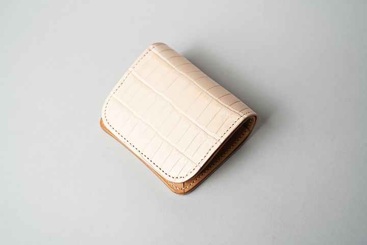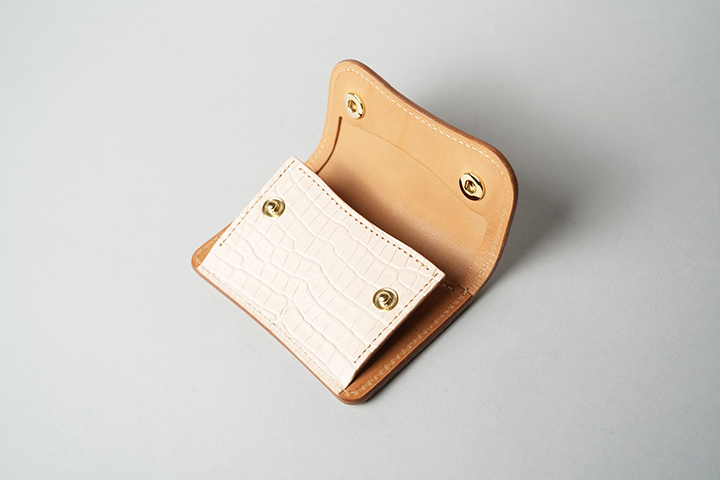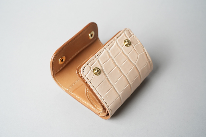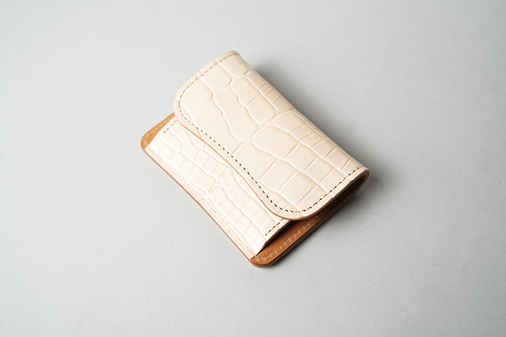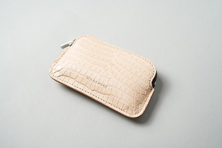 手のひらサイズでありながら、カード、紙幣、コインのすべてが収納できるCASA。外装は背面のポケットを含めてヌメクロコが一面を覆います。内装は一転してバスタン&フィスのヌメ革を用いた仕様です。ほのかに褐色を帯びた皮革を内装に用いることで、ゆっくりとエイジングが進みます。