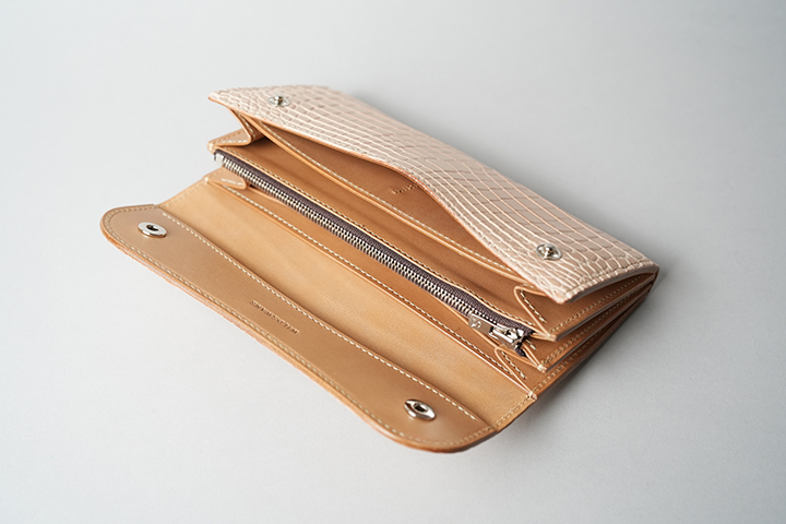 軽量でコンパクトなMINASは、カードケースやミニウォレット、キーケースまで幅広くご使用頂けます。YKKのエクセラファスナーを開いた収納部にはプラスチック製カードが最大15枚収納可能です。ヌメクロコを比較的手軽にお楽しみ頂けるアイテムですので、ご興味がある方はMINASからのチャレンジをおすすめします。