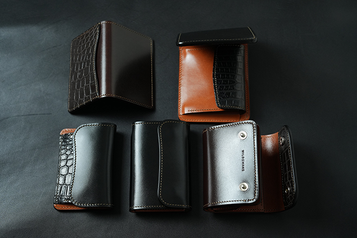 サドルプルアップはWILDSWANSがブランド創設時より、製作に使用する皮革で高い耐久性とタンニン鞣しによるエイジングが魅力です。ブラックとチョコは定番カラーとしてお馴染みですが、2つのカラーよりもエイジング幅が大きなキャメルカラーは、スポットカラーとして時折登場する人気のカラーです。クロコダイルも長らくWILDSWANSで製作に用いている皮革ですが、サドルプルアップにも劣らない耐久性を持ちながら、個体ごとに異なる斑柄により、二つとして同じ表情のアイテムは存在しません。このような特性を一つの製品でお楽しみ頂けるアソートレザーシリーズのアイテムは、7月13日昼12時よりWILDSWANSの直営店であるWILDSWANS銀座店とWILDSWANS Online Shopにて一斉に発売させて頂きます。各店の詳しい販売方法については、【アイテムごとのご紹介】の後にご案内しています。