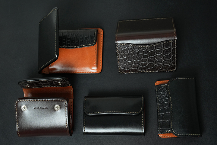 1つのアイテムで、複数の皮革や色をお楽しみ頂ける新しいシリーズがアソートレザーシリーズです。パーツごとの切り替えを多用することで、WILDSWANSでお馴染みのアイテムもいつもとは異なるユニークな顔を覗かせます。ブラックとチョコを基調にした2つのカラーバリエーションの中に、サドルプルアップのキャメルを共通して使用することによりエレガントなテイストをミックス。また、どちらのカラーバリエーションも糸色にはライトブラウン、金具にはシルバーカラーのホックを採用することで、各アイテムごとにバランスよくまとめ上げています。一方で、これまでに発売したトリプルレザーシリーズよりもクロコダイルを使用したパーツの数を2倍に増やすことにより、非常にリッチな仕上がりとなりました。