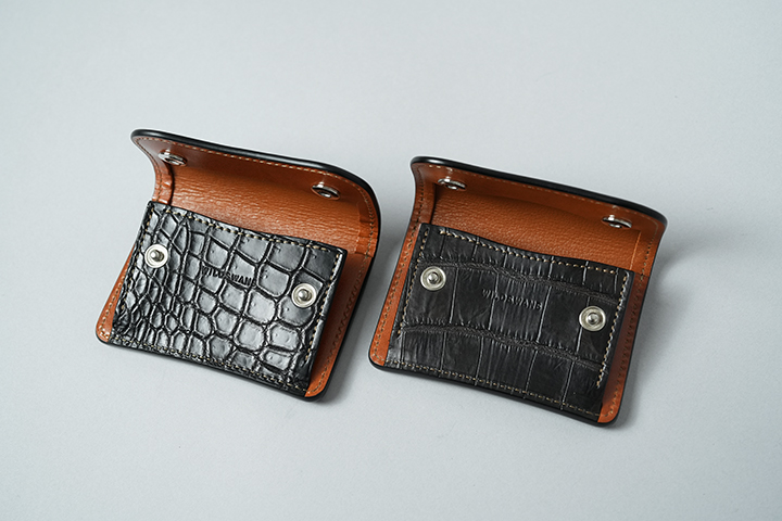 最初に登場するアイテムは、WILDSWANSでもっとも製作数の多いTONGUE。クロコダイルを背面ポケットと表側メイン収納部の前身に使用したダブルフェイスバージョンです。シリーズ中で唯一、外観から3素材のコントラストが美しく映える特別なコインケースに仕上がりました。カードは背面ポケットに1枚、メイン収納部の仕切りの後ろに2枚、100円硬貨ですと10枚程収納できます。