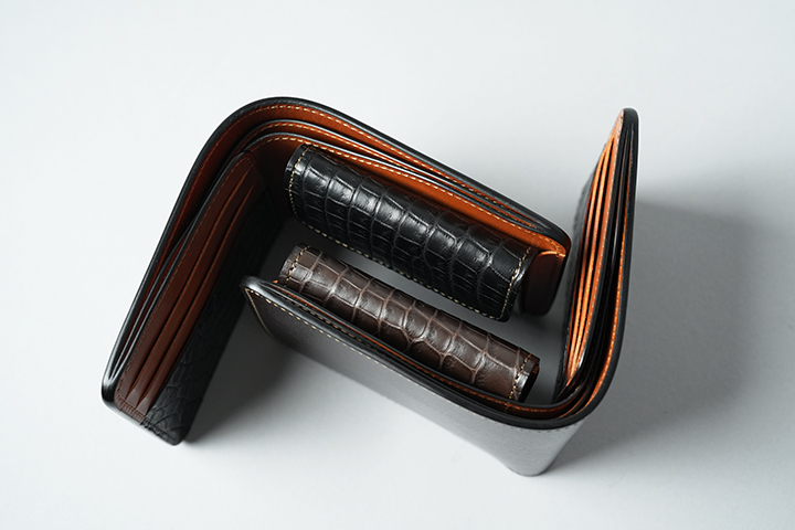 先頃発売となったばかりのPONTも当シリーズでも登場します。外装は単色のサドルプルアップの一枚革パーツですが、フラップを開けると内装は明るいキャメルを中心にクロコダイルパーツが立体的に現れます。PONTはカードやコインをメインに収納する方におすすめのウォレットです。紙幣は二つ折りでの収納ですが、近年は紙幣自体をそれほど使用しない方も増えていることから、携帯性を優先するのであればPONTが最適なウォレットになるかもしれません。