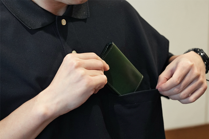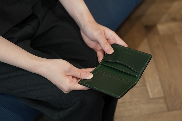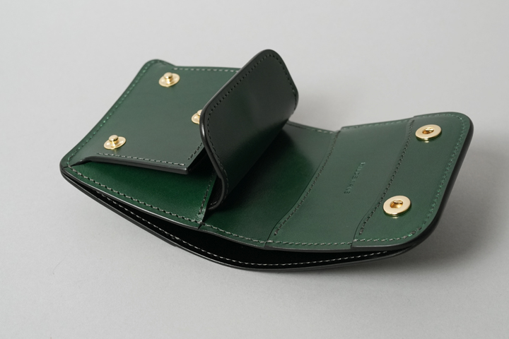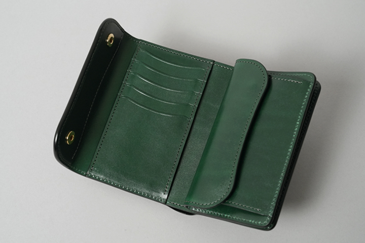 硬貨、お札、プラスチックカードを収納することができ、ズボンのヒップポケットにも入るミニ財布です。コインケースの裏にカードをまとめて収納できるよう最小限のパーツ配置に留めており、素早い操作感をお求めの方にピッタリのアイテムです。