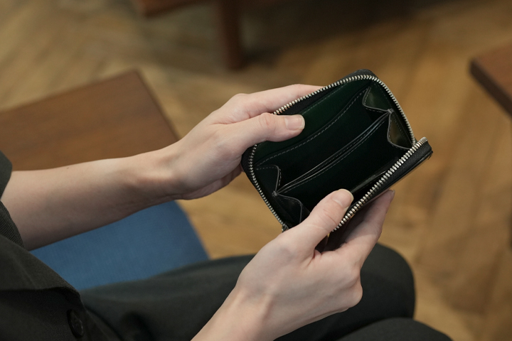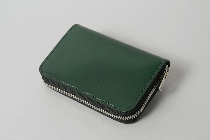 YKKのファスナーを備えたボックスのような出で立ちのウォレット。内装は細かく部屋が分かれ、小物を入れたりカードケースとしてもご使用いただけます。