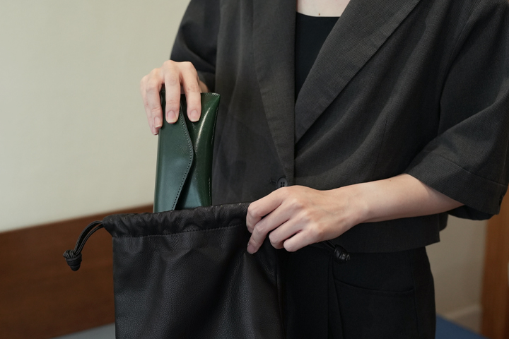 ※一部裏貼り部分には国産型押し牛革のブラックを使用しています。