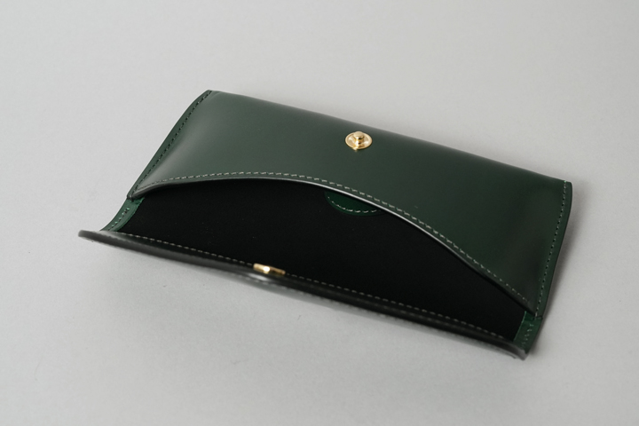 曲線の中にもシャープさを残したメガネケース。マチパーツを用いずに立体感をキープし、内装に貼られたスエードが大切な眼鏡を守ります。