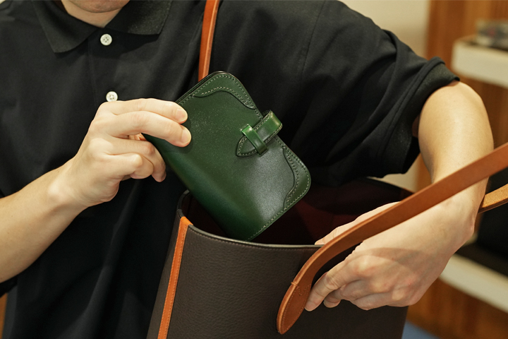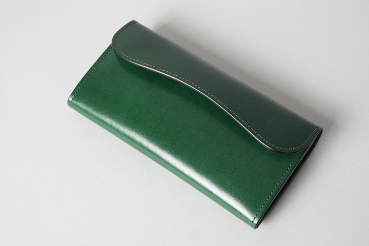 収納力をお求めの方におすすめの長財布。収納部がすべて上側に向かって開いているので、扱いやすさや見やすさにも優れています。大きな板面を使用した外装は革の表情を存分に味わうことができ、エイジングを楽しむこともできます。