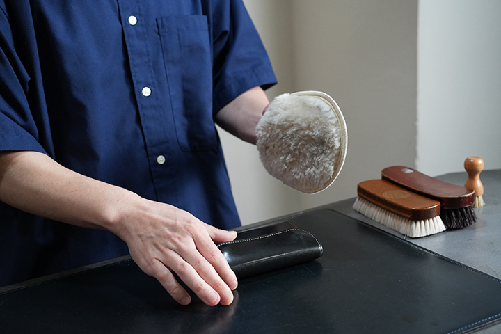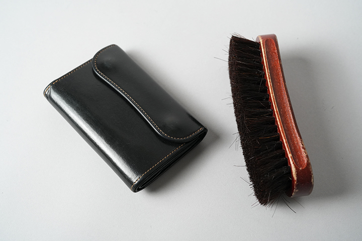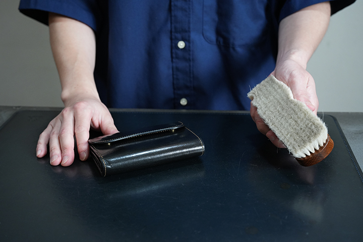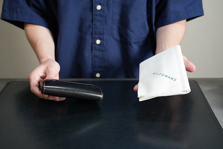 お使いのWILDSWANS製品をより良い状態でお使い頂くための基本的なお手入れとして、先ず初めに行うのはブラッシングと乾拭きです。こちらを1ヶ月に一度程度して頂くことで、曇りの原因になる汚れを除去して製品をキレイな状態に保ちます。ブラッシングと乾拭きはメンテナンスの基本中の基本となりますが、小型の財布一つでしたら平均所要時間は2分程度ですので、是非お試しください。