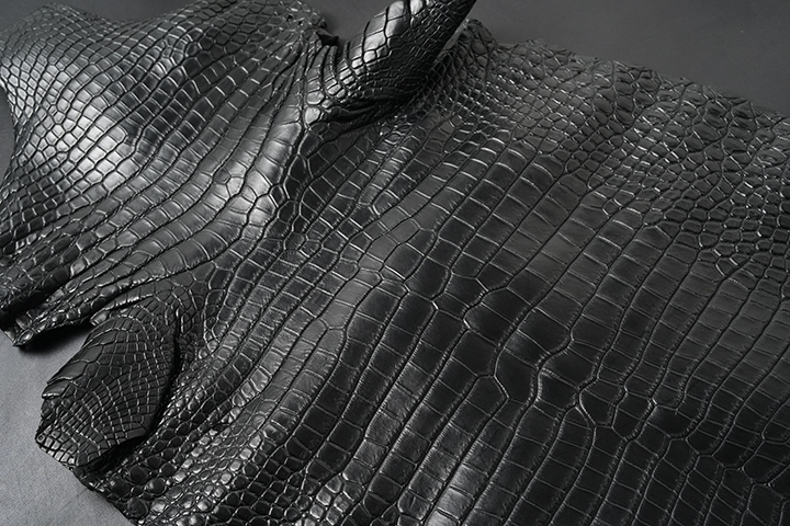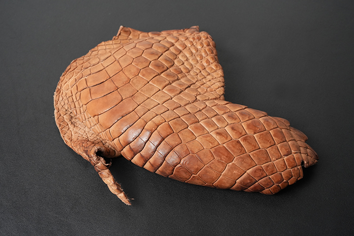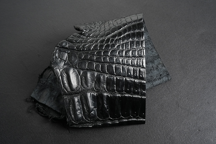 至高のレザーアイテムの製作には最高級の素材が必要ですが、先ずはこちらの素材のご紹介からさせて頂きます。今回のシリーズでメイン素材として製作に使用する皮革は、イギリス・ベイカー社が特別に生産するベイカーオークバークポロサスです。WILDSWANSでは、フルグレインブライドルレザーでお馴染みのベイカー社。某大手メゾンから支給された特別なポロサスをオークバーク(楢の樹皮)から抽出したタンニン溶液を用いるベイカー社秘伝のレシピによりじっくり鞣していきます。一般的に、ポロサス(上の画像2枚目)は4種あるクロコダイルの中で最も高級とされるレザーですが、ここでポイントとなるのは「某大手メゾンから支給された特別なポロサス」という部分となり、端的に言えば「普通のポロサスではない」ということになります。一体何が違うのか。その答えは、このベイカーオークバークポロサスの鱗(斑)に現れています。鱗を拡大した上の画像3枚目をご覧ください。通常のポロサスあるいはクロコダイルと比べるとベイカーオークバークポロサスの鱗は、より立体的でふっくらとした上品な形状をしています。また、製造時に使用するロウ分などの影響からなのか、その光沢は少しマットでスモーキーな雰囲気があることも特徴です。こうしたポロサスが供給されるのは一部の大手メゾンに限られるため、普段ですと中々お目にかかれるものではありません。