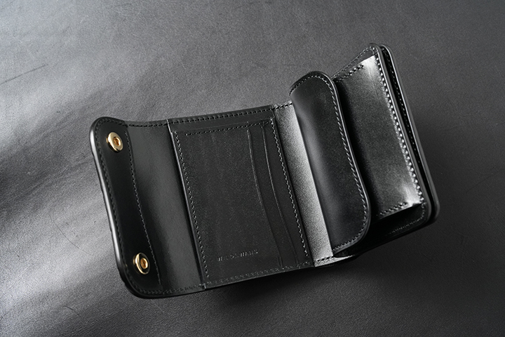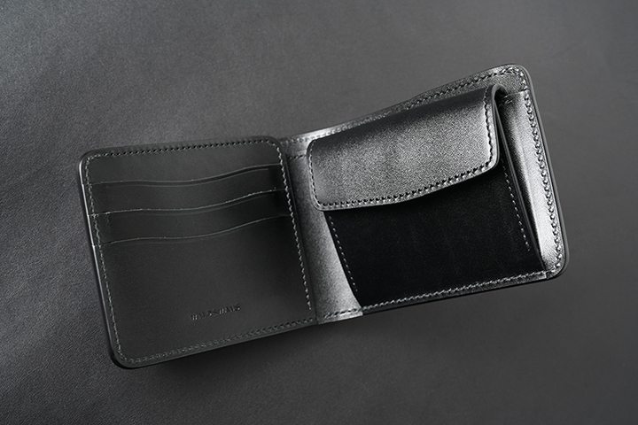 定番の二つ折り財布もベイカーオークバークポロサスにより、新たな一面を覗かせます。比較的コンパクトなアイテムですが、ベイカーオークバークポロサスの外装を開いた様子は圧巻の一言です。内装は外装とは異なる艶を持つサドルプルアップのブラックが一面に使用されています。