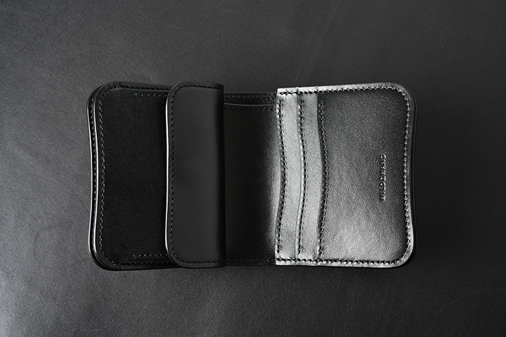 内装には、WILDSWANS製品の製作には欠かせないサドルプルアップを組み合わせました。メイン素材に合わせてサドルプルアップ、さらに縫製についても同色のブラックを採用することで、製品としての統一感を強く意識しました。サドルプルアップを生産するベルギーのマシュア社も皮革業界では一目を置かれる存在です。なぜならサドルプルアップに用いられる分厚い牛の原皮を鞣すことができるタンナーは、マシュア社など世界でもほんの一握りしか存在しないからです。こうした優れた技術は、高い耐久性が要求される馬具に対応するため開発されましたが、驚くべきことに150年以上前にはこうした技術で馬具の生産をしていたそうです。サドルプルアップもタンニン鞣しの皮革ならではの美しい艶を伴うエイジングが特徴ですが、実用面においては内装に用いることで製品に頑強な軸を形成します。上の画像2枚目ではスタッフが10年使用した名刺入れ・サドルプルアップSTING(廃番)のブラックを掲載しています。所々に経年のキズは見られますが、10年使用したとは思えないほど皮革のハリ感は損なわれていません。