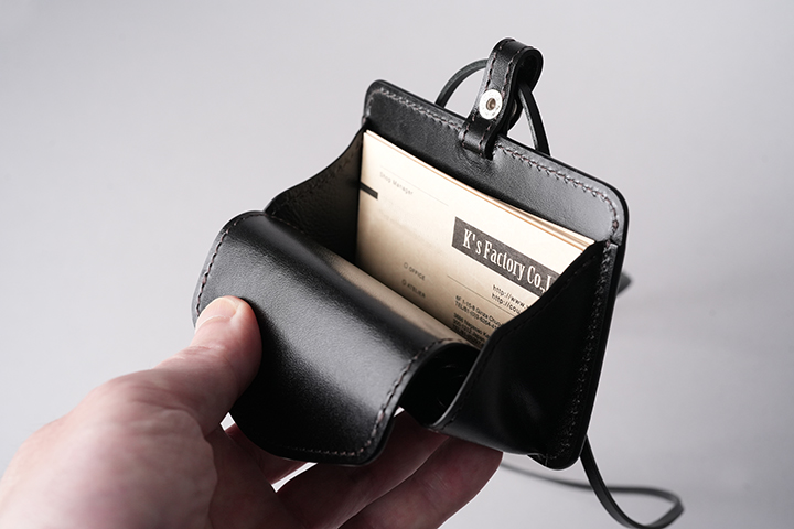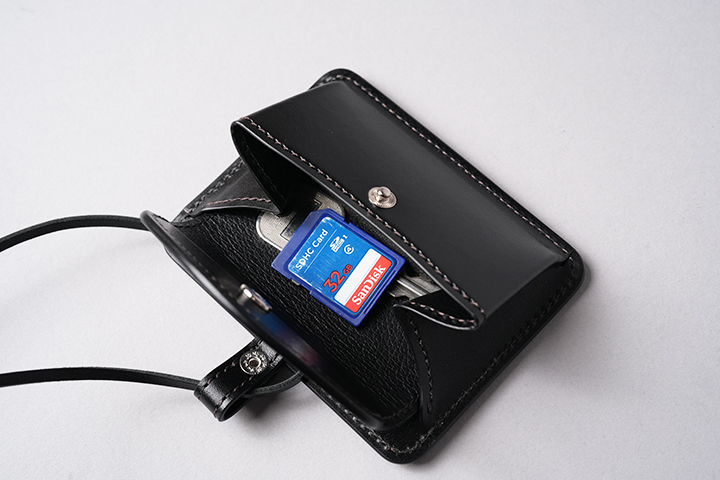 IDケースの裏面には、フラップ付きのポケットを設けています。VERITEは首から下げて使用することを想定していますが、フラップに留め具として1点のホックが付けることで収納物の落下を防ぎます。フラップの内側は、上側バネホックの当て革を除くと全面に裏貼りの型押し革をあしらっています。この中にはコインや鍵、SDカードなどの収納がおすすめです。さらにフラップはホックを解除して手前に引っ張ることで背面にスペースが生まれますが、こちらにはプラスチック製のカードだと約3枚、または名刺の場合ですと約10枚の収納が可能です。ポケットを含めたVERITEの奥行は24mmとなりますが、実際に装着した場合、ポケットの体への干渉はほとんど気にならないレベルです。