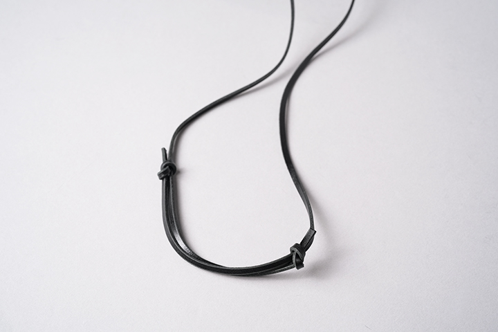 VERITEに付属するストラップは本体と同色のサドルプルアップで製作しています。ストラップは上部の2箇所に結び目がありますが、こちらで長さを微調整することができます。ストラップとIDケースを繋ぐ留め具にもホックを付いていますが、ストラップを外す場合はこちらのホックを解除します。BLACKとCHOCOLATEのカラーについては、背面ポケットを含むIDケースの本体のコバ(革の裁断面)に黒い染料を用いて磨きをかけています。ストラップのコバには染料を使用していませんが、全カラー共に皮革表面のカラーも含め装着時に摩擦などで移染が起こる可能性がありますので、できるだけ暗いトーンのお召し物と合わせて頂くことをお勧めします。