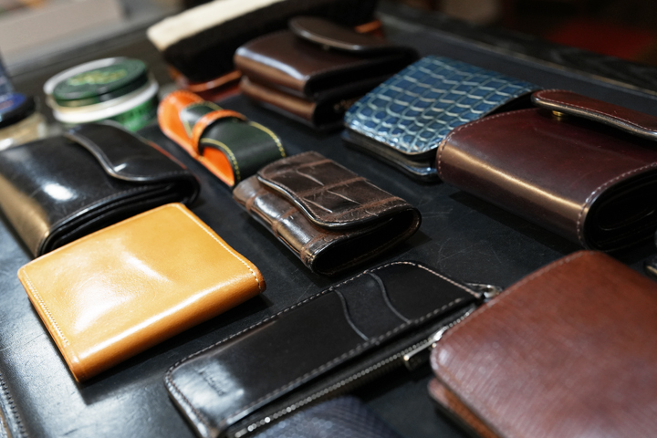 取り扱う皮革はサドルプルアップ、フルグレインブライドルレザー、シェルコードバン、クロコダイルなどのアイテムを予めご用意した上で、そのうち何種かをピックアップしてメンテナンスの実演を行います。