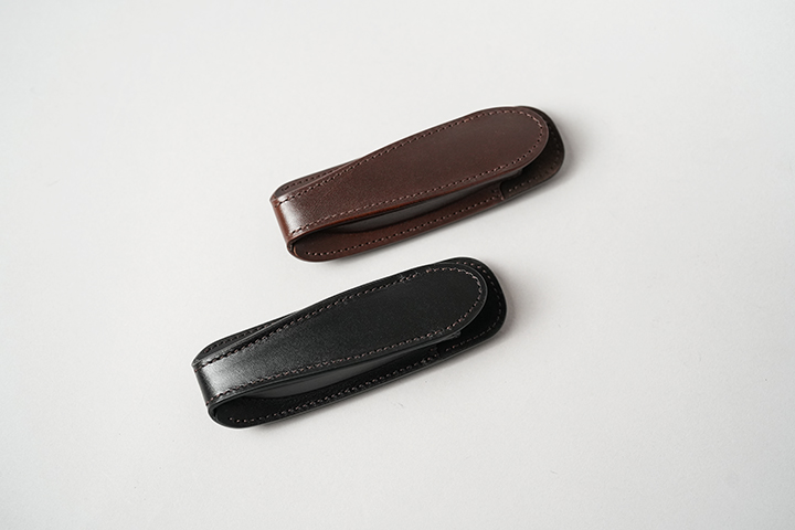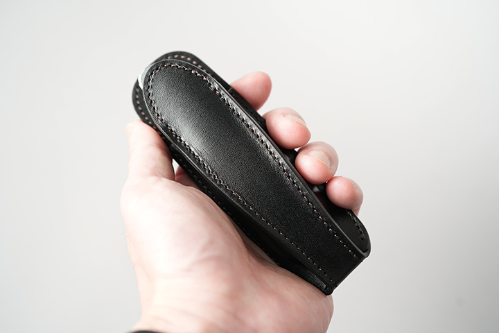 外装の4面にはそれぞれ芯材を入れています。こちらの目的として、外部からの衝撃から収納したソムリエナイフをしっかりと保護すると共に、長年の使用にも耐え得るように形が崩れにくい仕様にしていること。さらに、様々な形状のソムリエナイフに対応するため、フラップがない形状でもホールド力を高める目的もあります。また、側面には職人が丁寧に磨きをかけたWILDSWANSならではのコバ(革の裁断面)が見られます。こちらは素磨きで仕上げることで移染が起こりにくい仕様です。