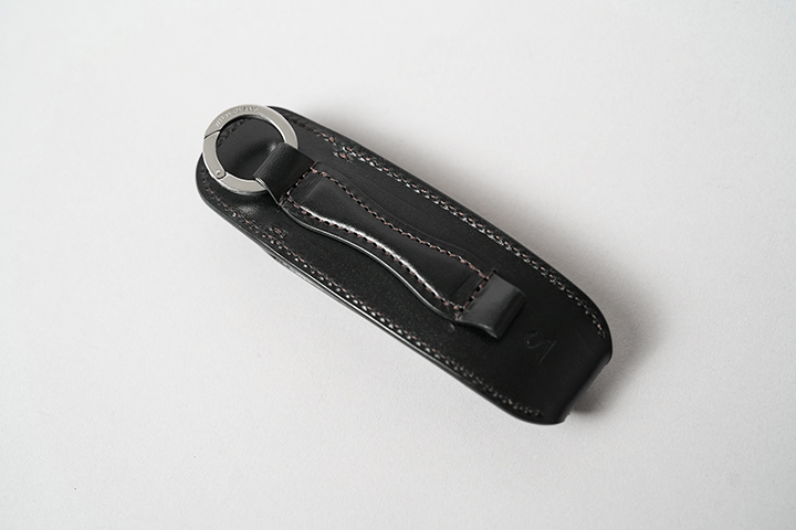 背面には当て革により3つのループ(輪)を形成しています。中央のループはベルトが通せるように他のループよりも大きなループです。上下2つのループはWILDSWANSのカラビナキーリングMに対応しています。例えば上のループにカラビナキーリングMを付けて、パンツのベルトループに装着することも可能です。あるいはWILDSWANSのショルダーストラップ・SADDLE PULL UP / TETHERとカラビナキーリングMを連結することで、首から下げて使用することも可能です(上の画像ではショートサイズを使用)。