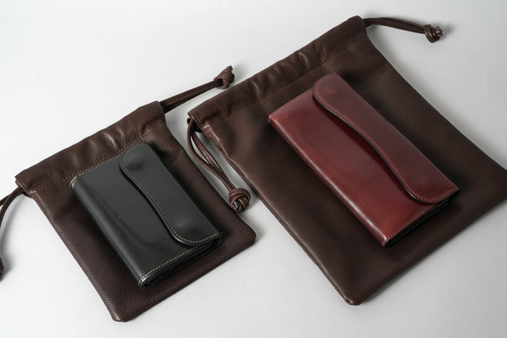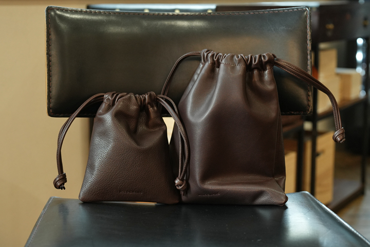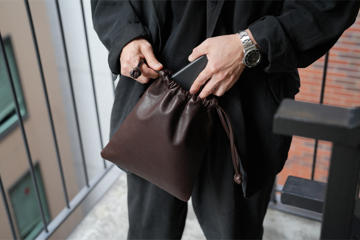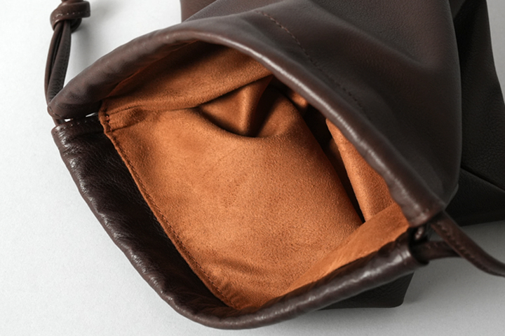 BOURSE(ブレス)、BOURSE(L)(ブレスL)は外装にラスティカーフ、内装にマイクロスウェードを使用したレザー製の巾着です。