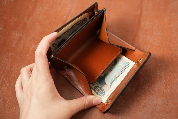 To maximize capacity, the bottom is left unstitched, keeping the gusset-free storage part slightly raised. This allows bills to be inserted into the gap beneath the part. While some wallets on the market allow unfolding bills, you can fold your bills in half for storage in this PONT wallet, too. It comfortably holds multiple bills.