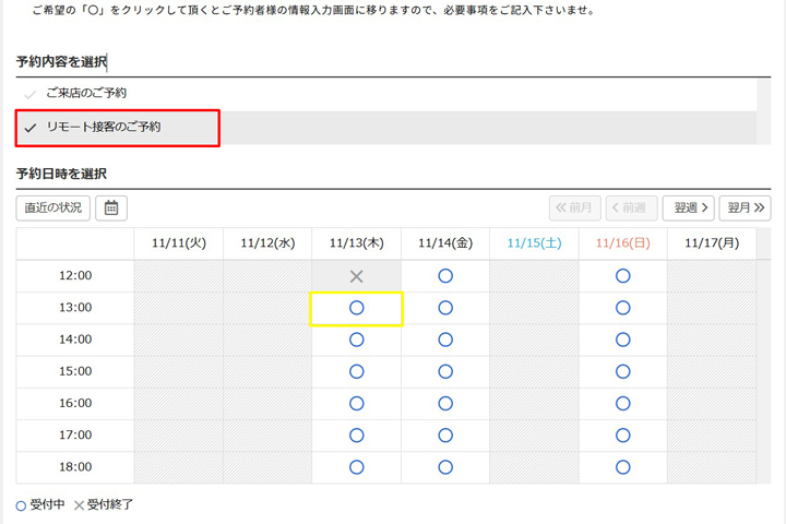 例えば11月13日の13時からのリモート接客をご利用される場合、赤枠部分の「リモート接客のご予約」を選択し、黄色枠部分の「11月13日13:00」をクリックすると予約者情報入力画面に進みます。