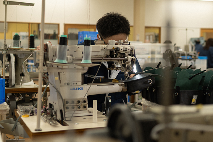 ショルダーストラップは表にサドルプルアップ、裏面にノボナッパを使用し、肉厚で強靭に仕上げています。長さ調整にはギボシを採用し、5cm間隔で5段階の調整が可能です。 ショルダーストラップは足踏みミシンで一目一目丁寧に縫製を行っていますが、表側のサドルプルアップに縫製の前段階でステッチ穴を開けておくことで、糸が締まりやすく、ステッチもより均一で美しくなるようひと工夫をしています。