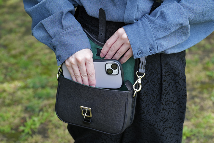 内装には手触りの良い人工スエードが貼られています。小ぶりな鞄ではありますが内径の厚みは4.5cmほどありますので、スマートフォン、コンパクトウォレット、その他細々したものをまとめて収納できる余裕があります。また背面側にマチ無しのポケットを設けているため、コンパクトミラーや定期入れなど薄型の物を収納するのに適しています。