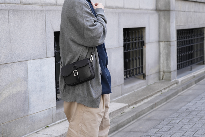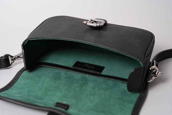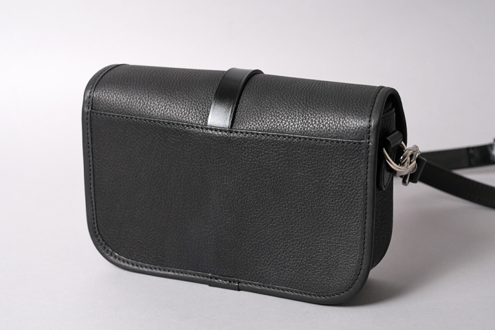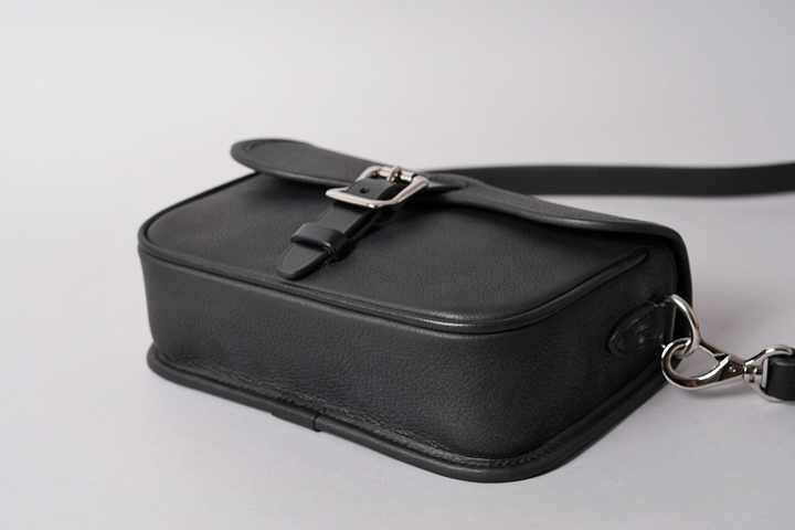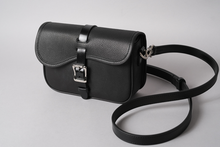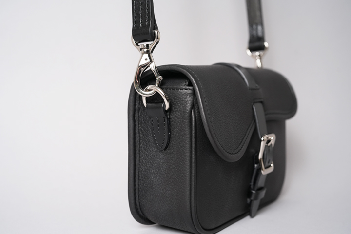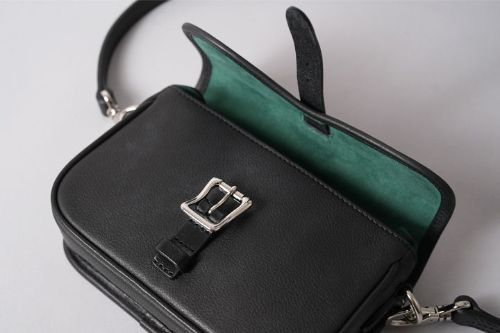 実は本体バッグのフラップのベルトと、サイドのDカンを止めるパーツにはサドルプルアップを用いてショルダーストラップの要素を取り入れています。 随所にクラシカルな要素や無骨さが取り入れられていますが、全てがバランスよく合わさることで、上品にもカジュアルにも表情を変えるアイテムに仕上がりました。