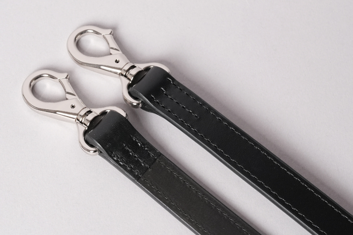 ショルダーストラップ端のナスカンを止めている部分には、SOMÈSの馬具から要素を拝借し、中心に縦ステッチを入れています。馬具においてこの縦ステッチは縦方向の張力に耐えるための構造ですが、今回のショルダーストラップにおいてはアイコン的な要素も含んでいます。