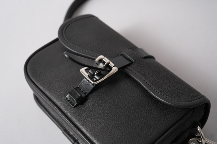 まずはバッグ本体のご説明からさせて頂きます。 バッグ本体は馬具から発展した、馬の鞍に装着する「サドルバッグ」をモチーフにしています。サドルバッグはSOMÈSがこれまでも幾度と手掛けてきたアイテムです。 バッグの中心に鎮座するバックルは、SOMÈSが定番で使用している「オカメ美錠」と呼ばれるくびれが特徴的なバックルです。鞍の曲線をイメージしたアシンメトリーなフラップと相まって、個性的なデザインの顔が印象的です。