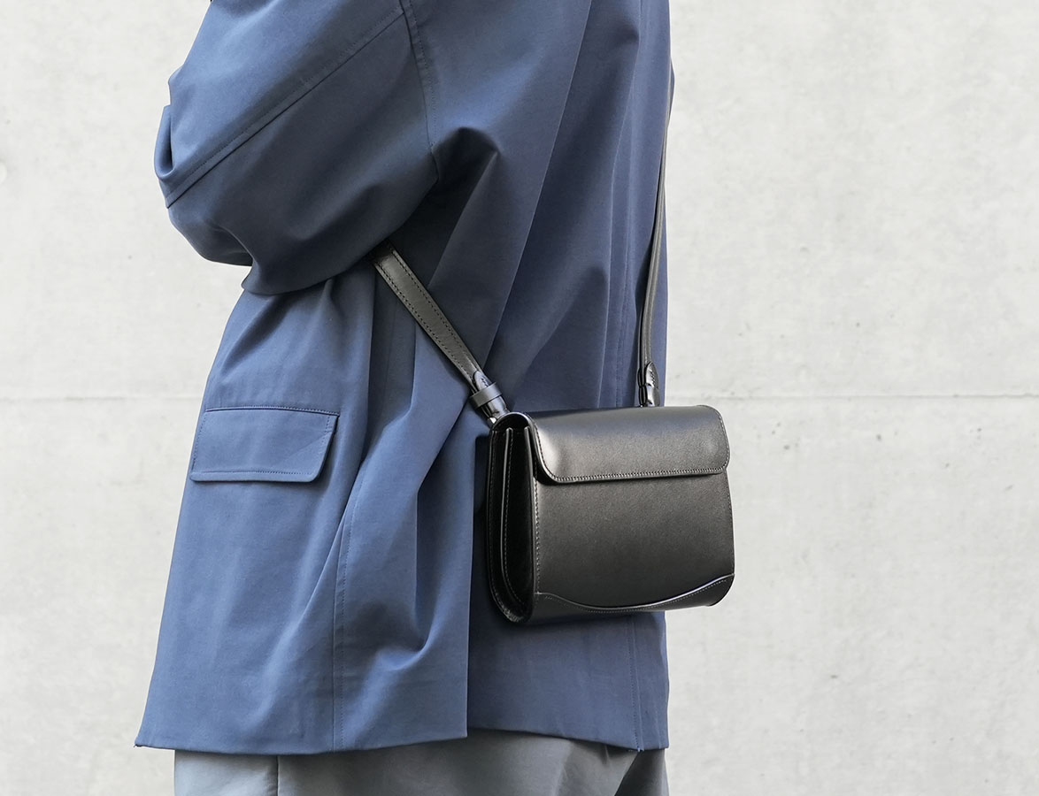 フラップ先端部分を除くとWILDSWANSらしい美しい曲線を随所にあしらったデザインが採用されています。マチ部分の本体からせり出たコバは、WILDSWANSのアイデンティティーとも言える仕上げ方法によって力強さと美しさを調和させ、RETRAを象徴するパーツとなりました。また、留め具にはこれまで主に財布などで使用しているホックが採用されるなど、従来からのWILDSWANSのイメージがそのまま投影されたミニショルダーバッグに仕上がりました。こちらのRETRAは、WILDSWANS GINZAがオープンする11月29日にWILDSWANS GINZAにて先行発売させて頂きます。RETRAの詳しい仕様などについては、この後ご紹介させて頂きます。