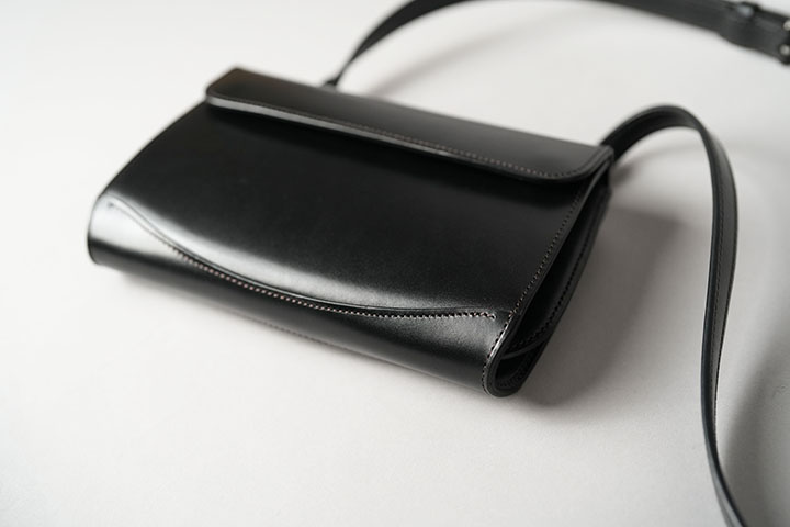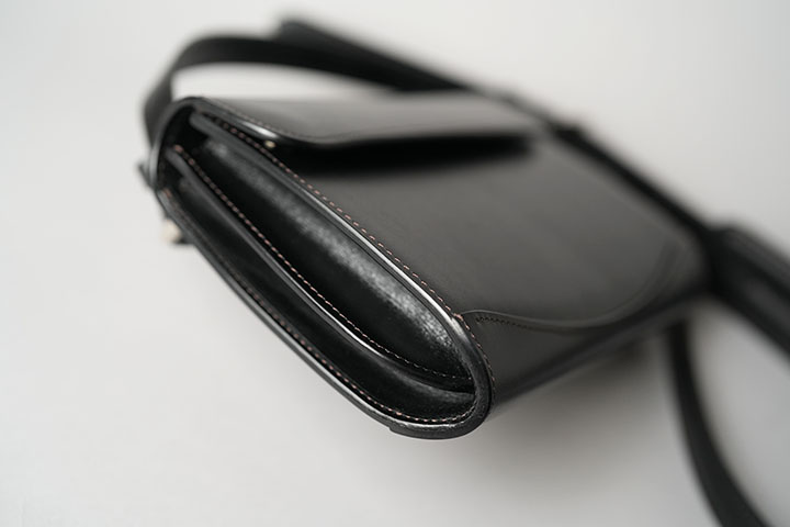 サドルプルアップはベルギー・マシュア社が生産する非常にハリ感の強い牛革です。昔から馬具にも使用されていた皮革のため、耐久性の高さも折り紙つきです。また、サドルプルアップは今日では珍しいタンニン鞣しで仕上げられていることから、使用することで透明度の高い独特の艶感が生まれます。WILDSWANSではお財布での製作が多いサドルプルアップですが、鞄でもそのポテンシャルを十分に発揮できる素材です。今回ご紹介するRETRA(レトラ)は、WILDSWANSが20年以上にわたって培った経験や技術を生かすことで完成したミニショルダーバッグです。