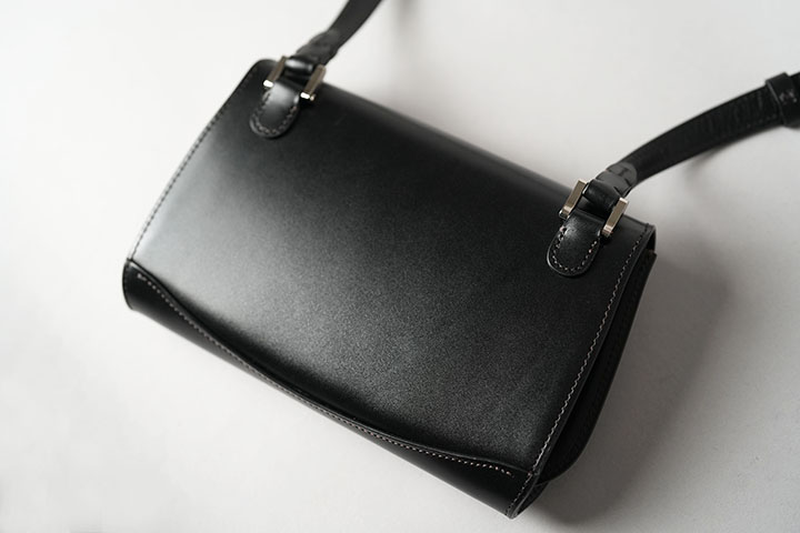 ・ショルダーストラップのコバには顔料を使用して仕上げていますが、強い摩擦や水分が付着した場合は移染が生じる可能性がございます。また、バッグの本体部分のコバには染料を用いています。ショルダーストラップよりも衣類への移染が起こりにくい部分にはなりますが、気になる場合はダークトーンのお召し物と合わせて頂くことをお勧めします。