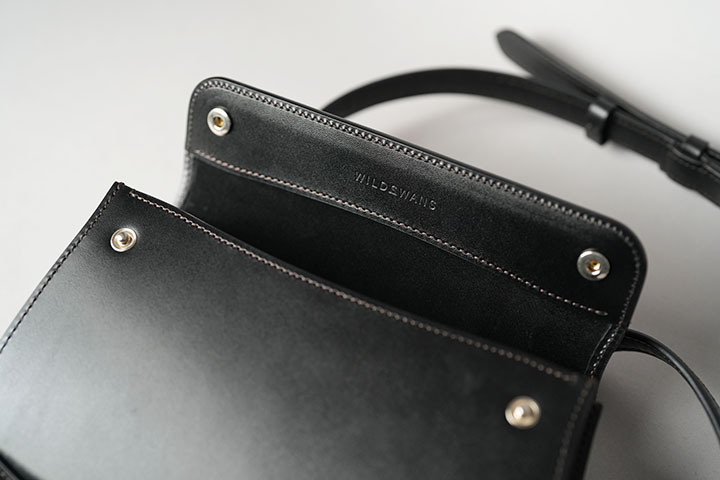 フラップの内側には、WILDSWANSのお財布などでも使用されるシルバーカラーのホックが左右に1点ずつ配置されます。フラップを閉めるたびに奏でる小気味の良い金属音からも、WILDSWANSらしさが十分に伝わってきます。また、フラップの内側の中央には、WILDSWANSのロゴが刻印されています。縫製の大部分は足踏みミシンで仕上げていますが、前身とマチを繋ぐ縫製やショルダーストラップなどの縫製の一部は手縫いにより仕上げています。いずれも熟練した職人の技術が必要不可欠なポイントです。メイン収納部は、内ポケットなどが一切付かない一室構造です。こちらの内装には上質な手触りのキッドスエードがあしらわれ、外装のサドルプルアップと共に収納したアイテムを優しく保護します。スマートフォン、財布、キーケースなどお出掛けに必要最小限のアイテムでしたら、余裕を持って収納ができます。