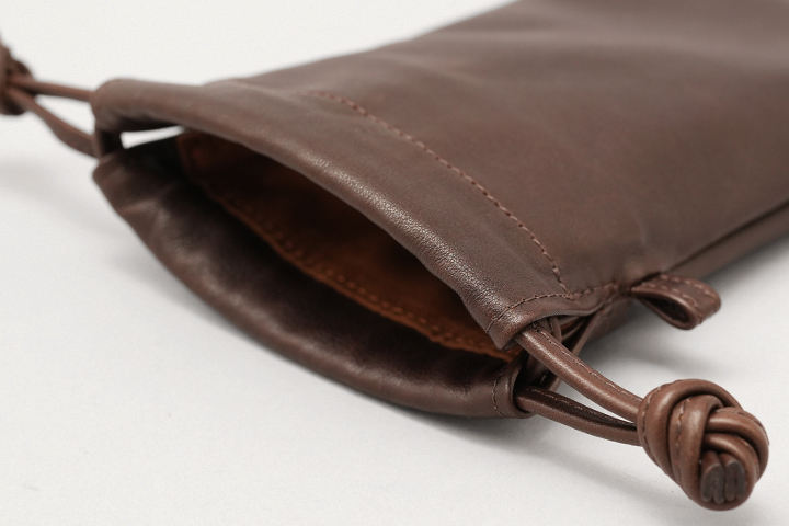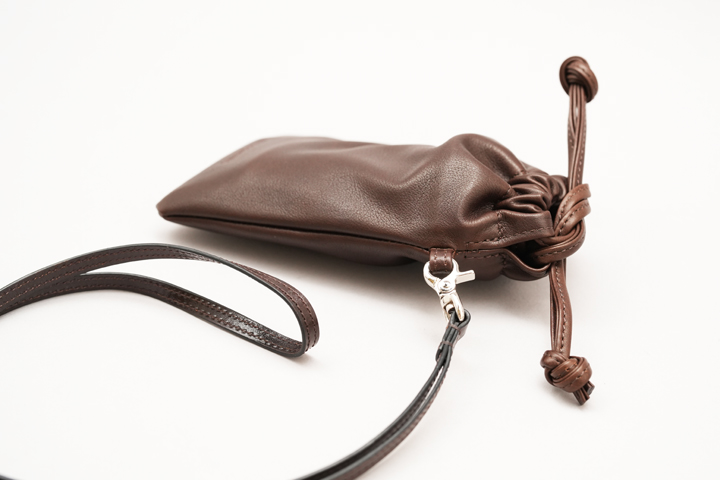BOURSEは口元を革紐で閉じるドローストリングバッグで、細々としたものを収納可能なアイテムです。メイン素材のアノネイ社(TANNERIE D’ANNONAY)のラスティーカーフはしなやかで弾力のある質感と高級感のある表情が特長です。