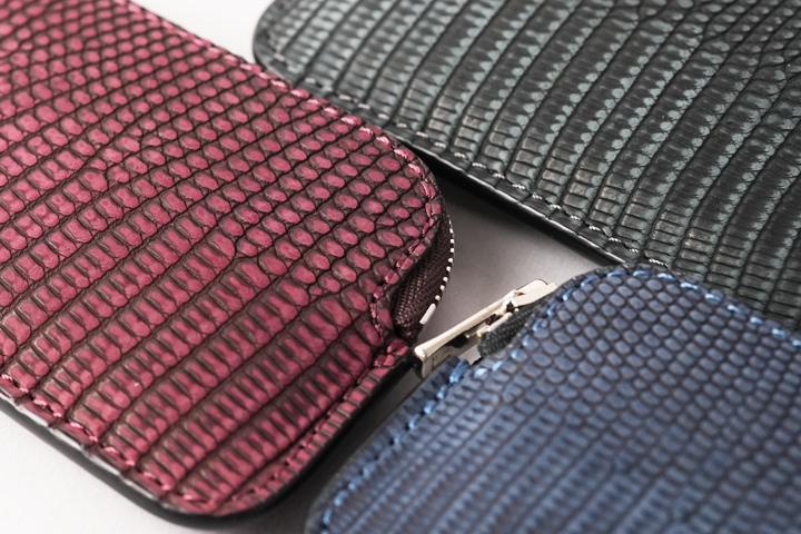 カラフルなヌバッククロコダイルを使用した革小物シリーズです。